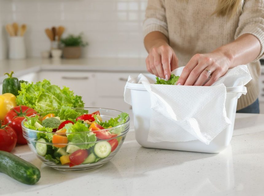 - További papírtörlő: Fedje be a salátát további 1-2 réteg papírtörlővel. Ez a felső réteg is segít felszívni a kondenzálódó nedvességet.